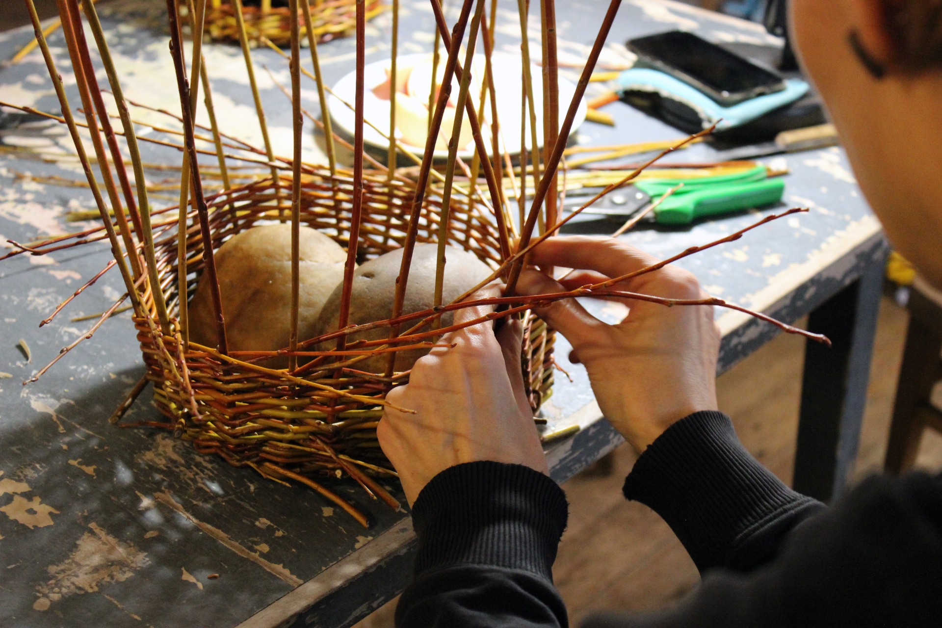 Učíme se různá sezónní řemesla převážně z lokálních materiálů. Kdo má zájem, projde si celým procesem včetně přípravy materiálu (sběr rostlin, sklizeň vrbového proutí, slámy, návštěva farmy při stříhání ovcí, čištění a třídění materiálu, apod.) Materiály si sama pěstuji (vrby, barvířské rostliny, žito) a získávám z farem (ovčí vlna, husí peří, vejce). Ostatní rostliny a přírodniny sbírám na okolních loukách a lesích. Vlnu si sama peru v dešťové vodě a eko prostředku, vyčesávám a barvím rostlinami. Z rostlinných barvících lázní získáme barevný pigment, ze kterého můžeme vyrobit třeba akvarelové barvy nebo pastel. Odpad z celého procesu je čistá voda a vyluhovaná rostlina, která se na kompostu promění v úrodnou hlínu.